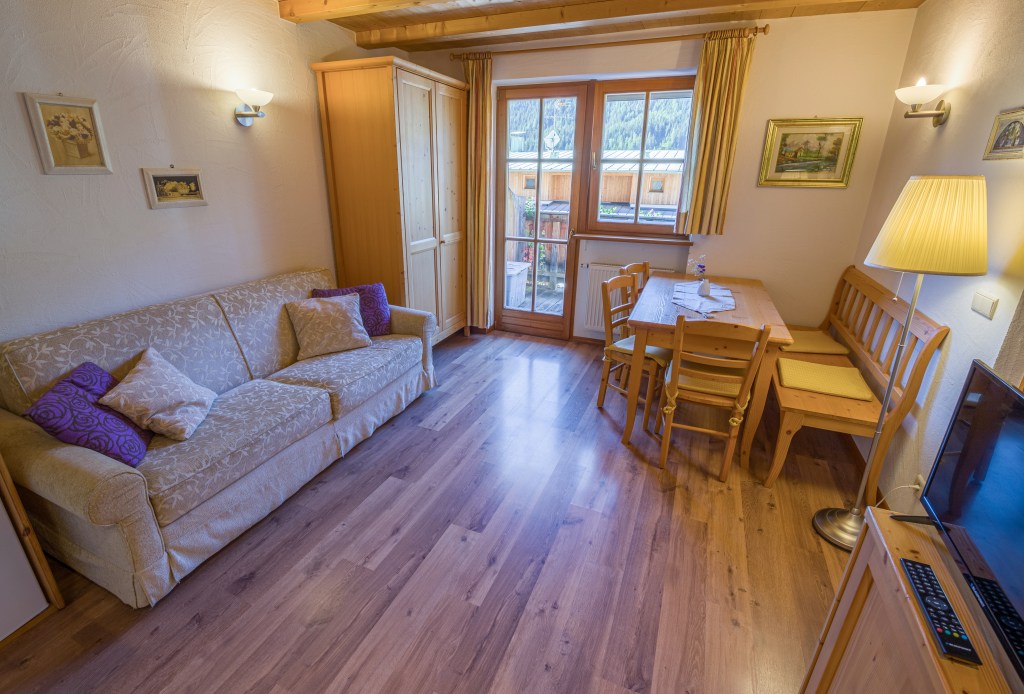 Wohnzimmer mit TV, Kochnische, doppelte ausziehbare Couch, großes Schlafzimmer, Badzimmer mit Dusche, Balkon mit Ausblick auf die Dolomiten